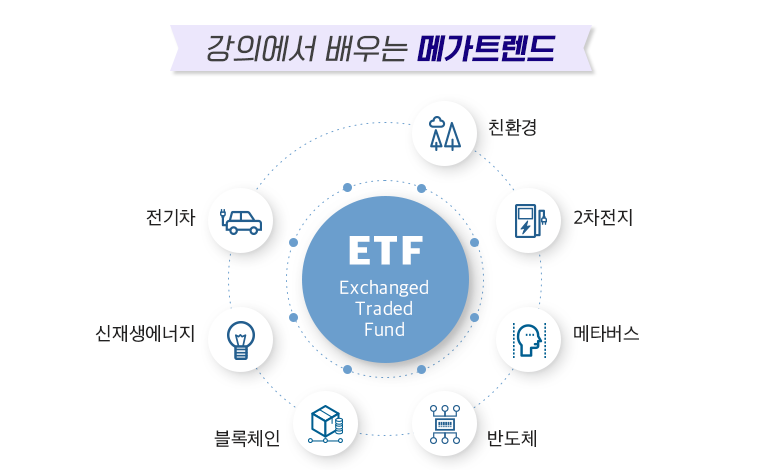 코로나 팬데믹 이후, 세상은 빠르게 변하고 있습니다. 코로나는 2030년에 일어날 수 있는 혁신적인 기술 발전과 세상의 변화를 가져왔습니다. 이에 주식과 같은 자본시장에 대한 투자문화도 빠르게 변화하고 있는 상황입니다. 주식은 우리가 평생 가지고 가야 할 투자자산인데요, 다만 투자대상은 알겠는데 그에 적합한 주식을 고르는 것은 투자자에게 정말 어려운 일이겠죠. 우리는 주식을 고를 수는 없지만, 투자 대상은 많은 정보를 통해 판단해낼 수 있습니다. ETF는 21세기 이후 가장 혁신적인 금융상품입니다. ‘내가 원하는 것에 가장 쉽게 투자할 수 있는 수단, ETF’. MKYU에서 ETF 투자에 대한 모든 것과 앞으로 투자해야 할 ‘혁신 성장 테마’에 대하여 공부해 봅시다. 여러분은 어렵지 않게 현명한 투자자가 되실 수 있습니다.