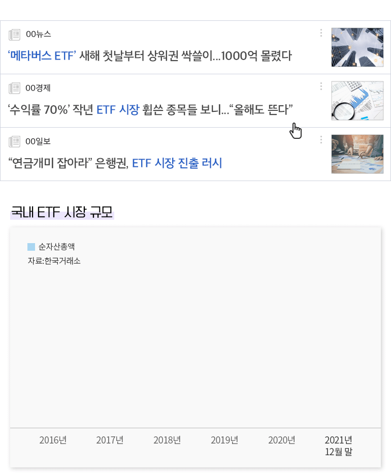 2021년 개인 투자자들이 국내 ETF를 매수한 금액만 10조 원 가까이 몰려 역대 최대치를 기록했고, 2022년 새해가 밝자마자 메타버스 ETF에는 1천억 원이 몰렸습니다. 이 기세를 몰아 여러 금융 전문가들은 ETF 시장이 앞으로도 더욱 커질 것이라 전망합니다.