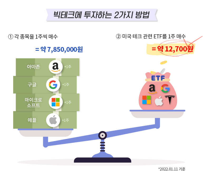 아래 그림처럼 미국의 테크 기업에 투자하고 싶어서 애플과 마이크로소프트, 구글 등 유명한 테크 기업을 개별 종목으로 1주씩 매수했을 때 무려 6,570달러(한화 약 785만 원/2022년 1월 중순 기준)가 넘는 자금이 필요합니다. 하지만 미국 테크 기업들을 모아둔 ETF 1주를 매수한다면 한 끼 식사 비용 정도로 비슷한 포트폴리오를 구성할 수 있어요. 즉, ETF는 주식보다 안정적이고, 소액으로도 투자가 가능합니다.