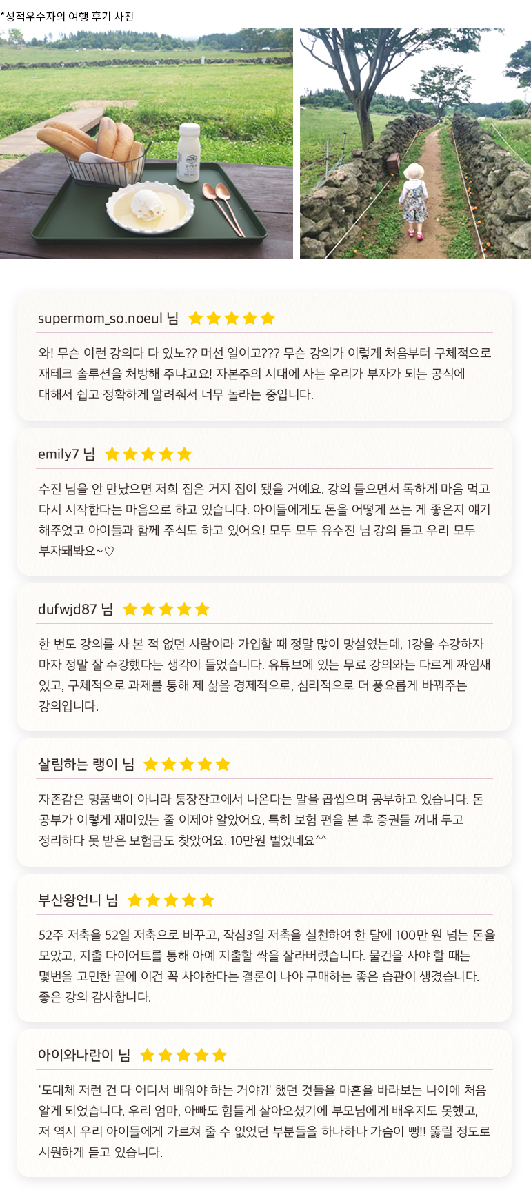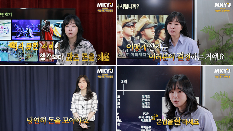 하지만 〈유수진의 독한 머니 아카데미〉와 함께라면, 여러분은 자신을 반듯하게 바라볼 수 있는 최고의 거울을 얻게 된 것이나 마찬가지란 말씀! 말 그대로 부자 언니 유수진 강사가 여러분을 독하게, 아주 독하게! 상상한 것 그 이상으로 독! 하! 게! 상대해드릴 거거든요. 아마 각오하시는 게 좋을 걸요? ^^