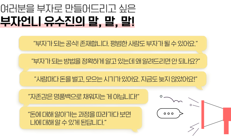 MKYU와 부자 언니 유수진이 오랜 시간 고민한 끝에 만든 이번 강의, 여러분을 부자의 길로 안내하기 위해 적어도 이것만은 얻을 수 있도록 준비했습니다.