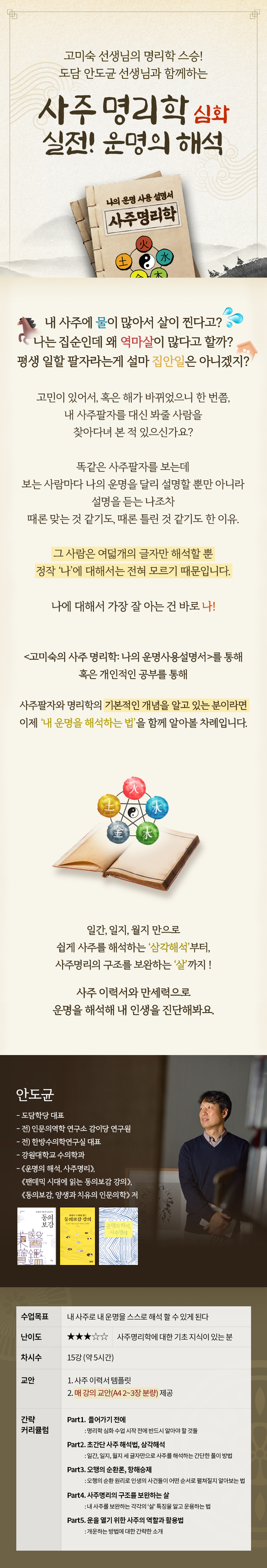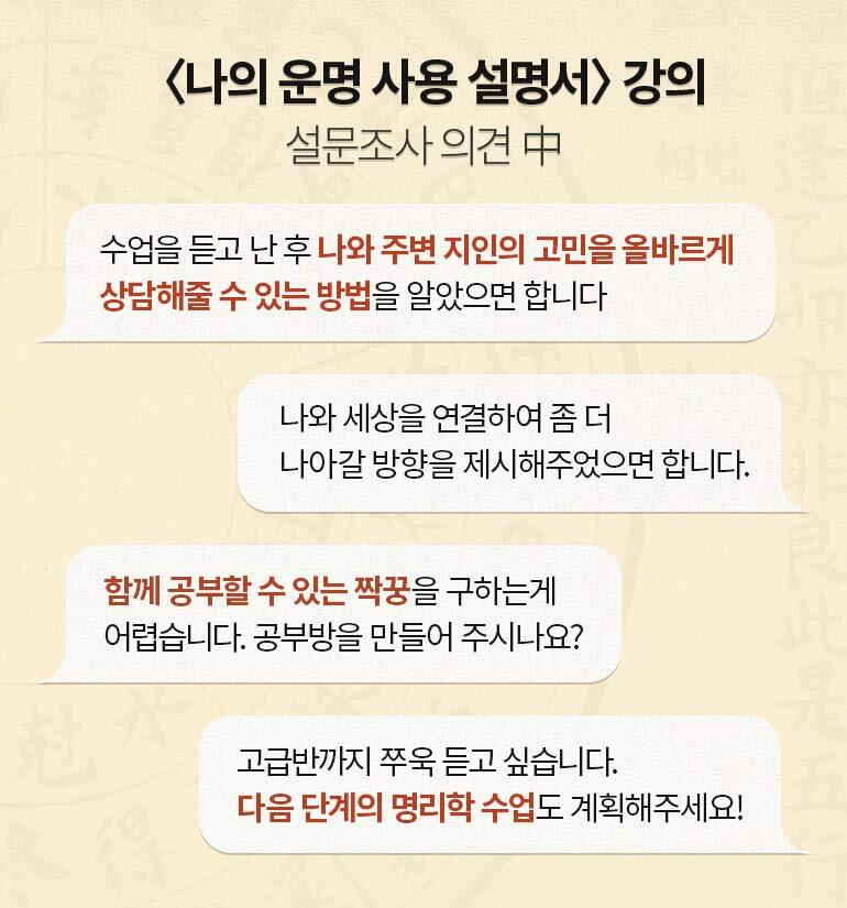 인생에 고난의 시기가 찾아와도 사주 해석을 통해 나아갈 길의 방향을 찾아 나갈 수 있기를 바라는 마음에서 준비했습니다. 강의는 끝나도 운명의 해석은 계속되어야 하니까요! 두 번, 세 번 계속 보고 필기해가며 꾸준히 공부할 수 있는 강의 자료와 함께 공부해 보세요.
