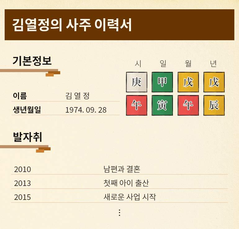 나에게 있었던 굵직굵직한 사건과 당시 느꼈던 감정을 연도별로 사주 이력서에 적어 보세요. 나의 인생 그래프를 그린다고 생각하면 조금 더 쉬울 거예요. 예를 들면 ‘2016년에 크게 아파서 병원 신세를 졌는데 쉴 수 있어 좋았음’, ‘2020년에 직장을 그만두고 스마트스토어를 시작함’과 같은 것들이요. 사주 이력서를 쓰는 이유는 간단합니다. 우리나라 안에서만 해도 한날한시에 태어난 사람이 수십 명이죠. 즉, 같은 사주를 가지고 태어난 사람이 수십 명 존재한다는 겁니다. 그러면 그들은 모두 같은 운명을 지닌 채 살아갈까요? 그렇지 않습니다. 이런 상황에서 필요한 것이 바로 내 인생의 서사가 담긴 ‘사주 이력서’입니다. 타고난 사주팔자인 만세력과 내가 걸어온 길이 담긴 사주 이력서를 함께 보며 운명을 해석하는 것입니다. 이 과정을 통해 왜 그 시기에 그런 일이 있었던 건지, 앞으로 나의 인생을 어떻게 운용해 나가야 할지 알게 되실 거예요.