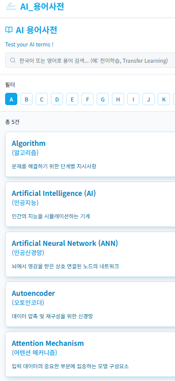 인공지능 노코딩 앱으로 인공지능용어 사전을 만들어서 함께 공부하고 있어요.