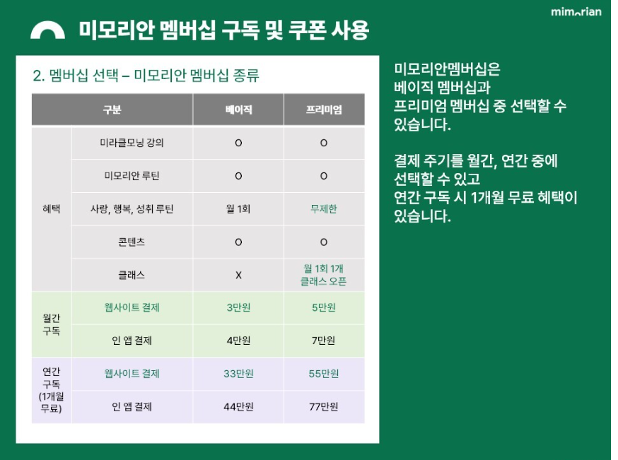미모리안 웹사이트에 로그인하여- 멤버쉽 (베이직 or 프리미엄)을 구독할수 있고