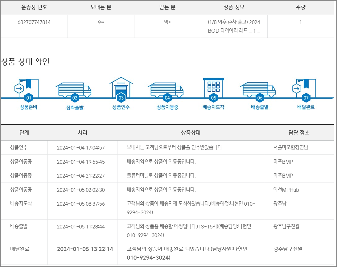 1월 1일 주문한 다이어리는 아래 정보로 1월 4일 출고되었습니다.