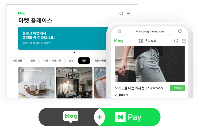 국내 최다 이용 블로그 네이버 블로그와 간편 결제 1위 네이버 페이가 만났습니다! 블로그를 운영하듯 마켓을 운영할 수 있어 온라인 마켓 초보자에게 안성맞춤! 이미 스마트스토어, 오픈마켓을 하고 있다면, 더 망설이지 마세요. 내 블로그만 있으면, 1인 마켓 사장님이 될 수 있습니다.