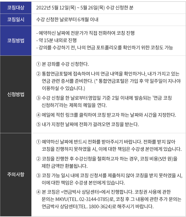 연금 상담, 받아보고는 싶은데 막상 전문가를 찾아가려니 시간과 비용이 만만치 않아 고민이었던 분이라면 이번 기회를 놓치지 마세요. 강의를 수강하며 생긴 궁금한 점도 물론 질문하실 수 있습니다. [★★★ 단, 별도의 폼을 제출하셔야만 코칭 진행이 가능합니다.]