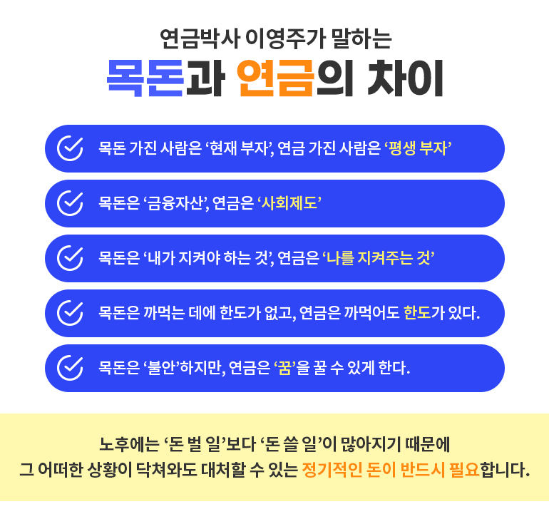 물론 노후를 위한 목돈을 마련하는 것도 정말 어렵고 대단한 일입니다. 하지만 큰 목돈을 유용하는 것보다 매달 들어오는 연금을 마련하는 것이 노후에는 훨씬 더 유리하다는 사실!