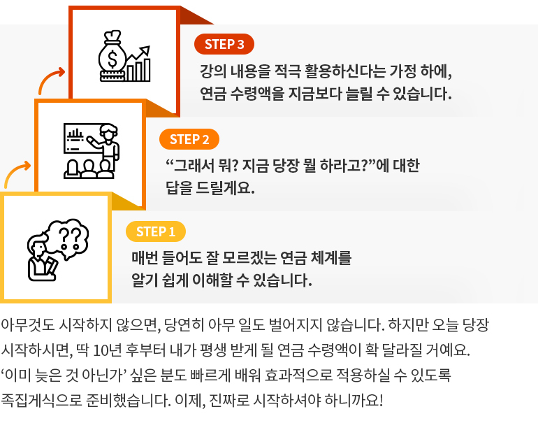 이쯤 되면 ‘노후 준비를 서둘러야겠구나’라는 생각을 하셔야 합니다. 그래도 영 체감되지 않는다면 이 강의를 수강하셔도 별 도움이 되지 않을 거예요. 하지만 ‘어라? 정말 큰일이네!’라는 위기감이 조금이라도 들었다면, 최소한의 비용으로 최대한의 효율을 뽑아낼 수 있는 ‘연금’에 집중하여 이 강의를 활용해보기 바랍니다. ‘연금박사’ 이영주 강사님의 〈오늘 당장 시작해서 평생 월 300만 원 이상 연금 받는 법〉 강의를 들는다면, 최소한 이것 3가지 만큼은 얻어가시게 될 거예요.