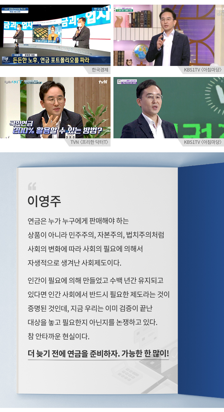 이영주 강사님에게 자산 상담을 받으시는 고객의 평균 나이는 60세! 본인이 어떤 연금에 가입했는지도 정리되지 않은 경우가 많습니다. 이들의 이야기를 듣다가 느끼게 된 것은 연금에 대한 사람들의 오해와 불신이 생각보다 깊다는 것, 눈앞에 있는 돈을 취하려다 평생 돈 걱정 안 해도 되는 ‘연금 찬스’를 놓치는 분들이 많다는 것, 그리고 올바른 연금테크 방법을 알려주는 이가 전무하다는 것이었습니다.