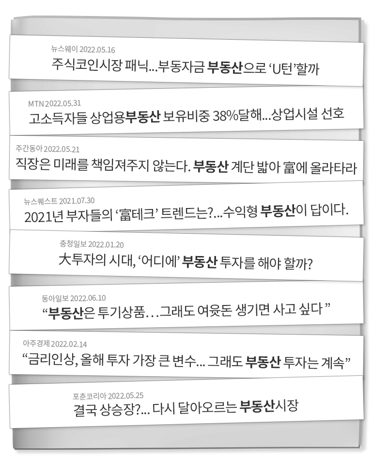 부동산 투자 전문가들은 입을 모아 얘기합니다. 부동산처럼 큰 결심이 필요한 투자 영역일수록 스스로 공부해서 쌓은 투자 근육이 필요하다고요. 아무리 팔랑귀라도 신중해질 수밖에 없는 것이 부동산이기에 스스로 안목을 높이고 정보를 모아서 ‘나 자신’을 믿어야지 제대로 투자할 수 있단 얘기죠. 이것이 바로 우리가 스스로 부동산 공부를 해야 하는 이유입니다.