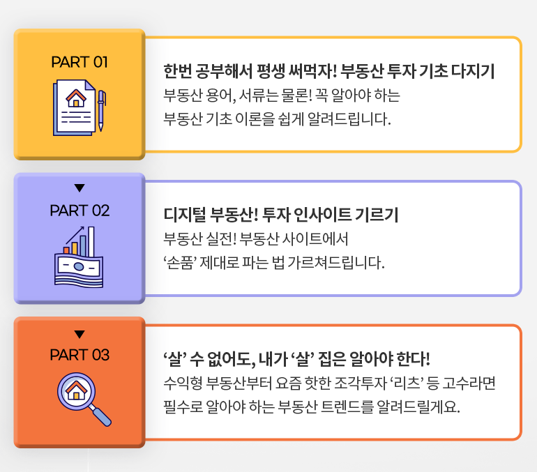 이토록 중요한 부동산, 여러분은 어떻게 준비하고 계신가요? 집 살 돈이나 모아야지, 돈도 없는데 무슨 부동산 투자 공부야? 하고 손을 놓고 계신가요? 그러다가 돈이 모이면 어느 날 덜컥 아무 부동산이나 매입해버릴 생각은 아니시죠? 부동산 공부에는 때가 있지 않습니다. 미리 준비해놓을수록 정보를 쌓아둘수록 시야는 넓어지고 기회는 늘어나는 게 부동산 투자니까요!