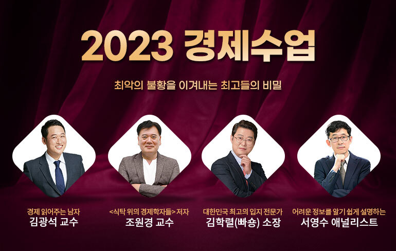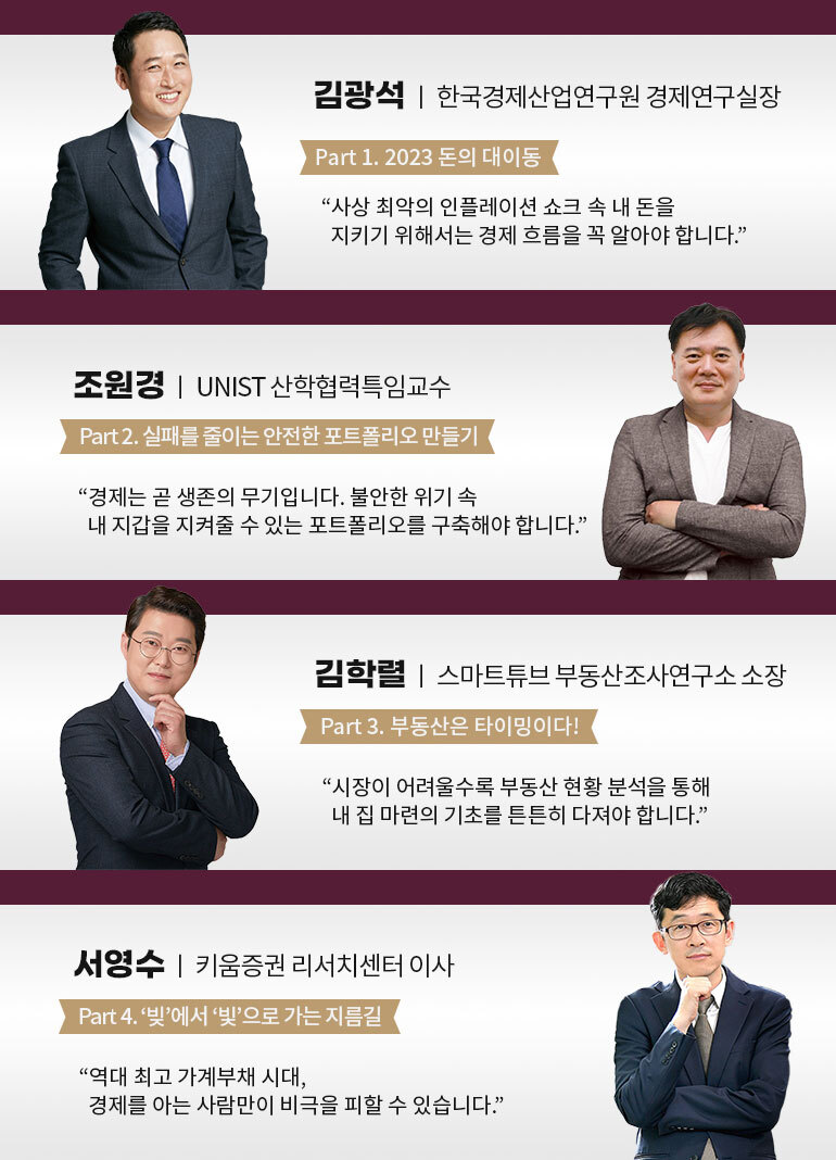 저희와 같은 고민을 하는 분이 분명히 계셨으리라 생각합니다. 그렇다면 이렇게 미래가 불안하고 앞날이 걱정되는 우리에게 지금 당장 필요한 것은 무엇일까요? 바로 여기에서부터 이 강의는 시작되었습니다. 2023년에는 조금이라도 희망을 얻어 보고자, 그리고 내가 무엇을 어떻게 준비해야 하는지 정확히 이해하고자, 경제 각 분야 전문가를 모셨고, 부디 ‘실질적인 정보’를 주십사 요청했습니다. 저희 스태프진에게도 꼭 필요한 강의였기에 마음을 다해 기획했고 드디어 선보이게 되었어요.
