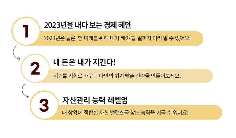 2022년에는 치솟는 물가와 금융 정책 변동 등 수많은 흔들림이 있었습니다. 그렇지만 누군가는 몰아치는 변화의 물결 속에서도 성공의 기회를 잡았고, 누군가는 지금 이 순간에도 그 변화에 쓸려가고 있지 않을까요? 경제 전문가들은 입을 모아 더 큰 ‘경제 위기’가 올 것이라고 말하지만, 이 클래스와 함께 경제 통찰력을 쌓아 나가며 나만의 위기 대책을 준비한다면, 남들보다 앞서나가는 한 해를 보낼 수 있을 거예요. 저희와 함께하는 여러분에게 이 세 가지만은 꼭 이뤄드리고 싶습니다.